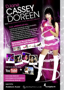 Einfach Anders, so könnte man Cassey beschreiben, wenn sie hintern den Turntables steht. 3 Jahre tourte Cassey Doreen durch ganz Europa, was sie zur Ausnahme Djane machte. Durch ihr Talent etablierte sie sich 2008 erfolgreich auf Ibiza. Seitdem ist sie dort regelmäßig als Gastdjane gebucht, in den geilsten Clubs und Partys auf der Insel. Aber auch andere Länder sind vor der jungen quirligen Djane nicht sicher, so überraschte sie in Bulgarien, Österreich, Italien, Schweiz, Marroco und auch in England durch ihre Musikauswahl und Können. Sie spielt für die Massen und schafft es ihre Ausstrahlung mit der Musik zu verbinden. Eine gefährliche Mischung, die jede Party zur Explosion bringt. Nun drehen sich die Plattenteller für das Sternchen am Deejay Himmel, auch dank der Unterstützung ihres Hauptsponsors, die Technikfirma American Audio. Cassey Doreen kommt nicht mit leeren Händen. Ihre zweite Single erscheint im Januar 2011, aber damit gibt sich Cassey nicht zu frieden, es werden noch weitere folgen. Das Jahr 2011 wird also alles andere als langweilig, denn Cassey gibt Gas und macht jede Nacht zur Party. CASSEY DOREENs Debutsingle ‚GIRLS JUST WANT TO HAVE FUN – eine Neuinterpretation des CINDY LAUPER Klassikers – schlug im Frühjahr 2010 ein wie die sprichwörtliche Bombe. Der Track fand nicht nur den Weg in die Spitzenpositionen sämtlicher Dance Charts sondern konnte die Tanzflächen der Clubs auch im Sturm erobern. Inzwischen wurde der Song auch von mehreren ausländischen Plattenfirmen (z.B. in Spanien, Skandinavien, Australien, Polen, Russland, Süd Afrika) lizensiert und wird seinen Zug um die Welt sicher noch fortsetzen. Dieser Track spiegelt auch das Motto der sympathischen DJane wieder denn, sie liebt und lebt ihren DJ Job und ihr gut gefüllter Booking Kalender, sowie ihre zahlreichen Fans (z.B. auf Facebook) sind Beweis dafür. Cassey hat genau wie die meisten ihrer männlichen Kollegen das DJ Handwerk von Grund auf gelernt und hat nicht als Seiteneinsteigerin (Ex-Model, Ex-TV-Moderatorin oder Ex-Geliebte eines Produzenten) den Weg hinter die Turntables gefunden weil es plötzlich schick ist. Mit ihrer guten Technik an den Decks, ihrer treffsicheren Musikauswahl und natürlich ihrer sympathischen Ausstrahlung sorgt sie stets für Party Ekstase auf den Tanzflächen. Sie spielt in erster Linie für ihr Publikum – dafür lieben sie die Leute. Nach so einem ,Start Up‘ Erfolg ist es sicher schwer das Level zu halten, doch mit der jetzt vorliegenden zweiten Single LIKE A VIRGIN beweist Cassey mal wieder Ihr Gespür für den Zeitgeist. Diesmal musste ein Originaltrack von niemand geringerem als MADONNA ‚dran glauben‘ und wurde von Cassey zeitgemäß für den Dancefloor aufbereitet. Der Track wird mit Sicherheit genau da ansetzen wo sich GIRLS JUST WANT TO HAVE FUN immer noch befindet: Auf absoluten Top Niveau in der Dance Szene. Für die Inhalte (Biografie, Referenzen, Styles und Extras sowie Bilder) sind allein die jeweiligen DJ's bzw. Künstler verantwortlich. |