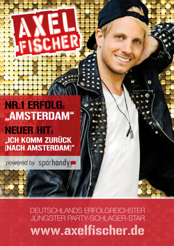 Der erfolgreichste jüngste Partyschlager-Star Deutschlands. Axel Fischer wurde bekannt als Hauptdarsteller der Pro 7 / VIVA TV-Soap „Abschlussklasse“ und stürmte bereits mit seiner Debut-Single „Mädchen mach dich frei“, dem Titelsong der TV-Serie, die Top 40 der Media Control Single Charts. Ganze 10 Wochen hielt sich der Gute Laune Song in den TOP 100 und verkaufte sich tausendfach. Folgetitel wie „Der Eskimo-Tanz“ brachten Axel Fischer ebenfalls beachtliche Chart- Platzierungen ein (Top 50 Media Control, Top 10 Musicload/iTunes Schlagercharts und Platz 1 AOL) und RTL zeichnete den Song in der ultimativen Chartshow als einen der erfolgreichsten Après Ski Hits aus. Mit dem Nr. 1 Partyhit „Amsterdam“ gelang Axel Fischer der große Durchbruch und Sprung in die "Champions League des deutschen Schlagers": Top 10 der deutschsprachigen Media Control Charts, über 30 Wochen in den offiziellen Media Control Charts sowie mehr als 200 Wochen (4 Jahre) Spitzenplätze in den DJ-Charts (Welt-Rekord)! Der Videoclip zu "Amsterdam" lockte alleine bei YouTube bereits mehr als 10 Millionen Besucher vor den PC. Das schaffte zuvor weltweit kein anderes Schlager-Musikvideo. Auch die Single „Du trägst keine Liebe in Dir“ kletterte direkt von 0 in die Top 10 der Media Markt / Saturn Verkaufscharts. Pünktlich zur WM 2010 landete Axel Fischer mit "TRAUM VON AFRIKA", der „Amsterdam-Fußball-Version“, den großen WM Hit: Platz 1 iTunes Schlager Charts, Platz 1 offizielle Party-Schlager-DJ Charts, Top 10 offizielle Media Control deutschsprachige Single-Charts, Top 40 offizielle internationale Single- Charts! Als erster Partysänger wurde Axel Fischer von RTL2 mit dem goldenen Mikrofon der "Neuen Hitparade" ausgezeichnet. Mit insgesamt über 1 Mio. verkauften Tonträgern (hierzu zählen auch namenhafte TVSampler wie "Ballermann Hits", "Après Ski Hits" und "Fetenhits") gehört Axel Fischer zur Champions League des deutschen Party/Pop-Schlagers! Ca. 200 Live-Auftritte pro Jahr stehen derzeit im vollen Terminkalender des Dortmunders (gebürtiger Schleswig-Holsteiner). Hierzu zählen u.a. auch Auftritte vor 1 Mio. Zuschauern beim Brandenburger Tor Berlin, Auftritte in der ausverkauften Westphalen Halle Dortmund, Lanxess Arena Köln oder Festivals wie Oberhausen Olé vor 50.000 Gästen). In der Sommersaison ist Axel Fischer wöchentlich auf Deutschlands beliebtester Ferieninsel Mallorca zu Gast (Oberbayern/Bierkönig), aber auch in Frankreich, Italien, Luxemburg, Belgien, Österreich, Schweiz und weiteren Ländern Europas ist Axel Fischer auf Tournee. Neben den Live- Shows ist er regelmäßig im Fernsehen zu sehen. Nach erfolgreicher Veröffentlichung der beiden Partyhits „Willst du mit mir gehen“ und der Schlager-Hymne „Ich liebe Schlager“ hat Axel Fischer im Frühjahr 2014 mit einer Neuauflage seines Rekordhits „Amsterdam“ (Reloaded Party Mix) erneut die Charts gestürmt und ist direkt von 0 auf Platz 1 der Musiklounge Partyschlager-Charts eingestiegen. Das Single-Highlight zum WM-Sommermärchen präsentierte Axel Fischer feat. Right Sad Fred mit „Steht auf für den Weltmeister!“ (deutsche Coverversion des internationalen Welt- Erfolghits „Stand up for the Champion“). Die Premiere feierten die Musiker gemeinsam mit 1 Millionen Fans vor dem Brandenburger Tor. 2015 landete Axel Fischer mit dem Remake von „Nessaja (ich wollte nie erwachsen sein)“ einen echten DJ-Hit (Platz 1 Après Ski Charts, Platz 2 Ballermann Charts). Seit Anfang des Jahres ist Axel Fischers erstes Best Of-Album im Handel, vollgepackt mit allen Hits (22 Songs inkl. vielen brandneuen Songs). Seine aktuelle Single „Ich komm zurück (nach Amsterdam)“ ist die langersehnte Fortsetzung des Erfolghits „Traum von Amsterdam“. Auch der zweite Teil schlug ein wie eine Bombe: von 0 auf Platz 3 der DJ Charts, Platz 2 der Amazon- und iTunes Charts und Platz 1 der Mallorca-Charts bereiten Axel Fischer einen der größten Erfolge in seiner Karriere. Referenzen (Auszug) AUSZEICHNUNGEN/AWARDS: